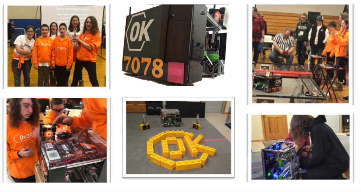 We attended the Old Home Day celebration introducing many people to our robotics team in our brightly colored tent. We had both of our robots from the past two years there and we were switching them out so that the kids got to see both of them at work. Kids who stopped by got to drive the robot and work with the other person to move the blocks around and shoot the rings into the goal.
